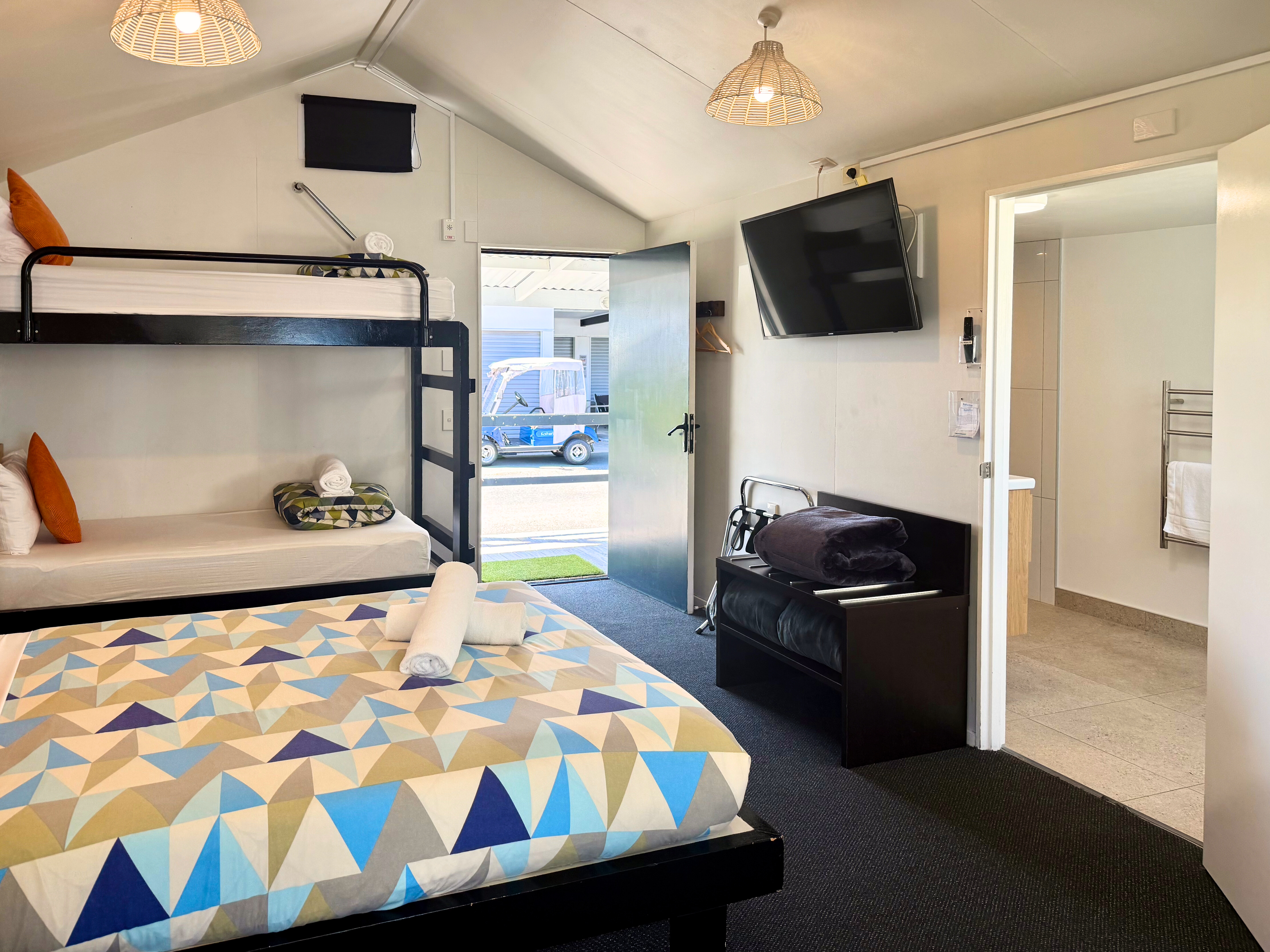 Ideal for families of four, with open plan living, one double bed, one set of single bunk beds, and linen provided. The cabin is well equipped with a TV, heater and a small kitchen including a fridge/freezer, kettle, toaster, single hot plate, microwave, crockery, utensils, and basic cutlery plus an ensuite bathroom with shower.